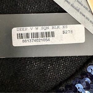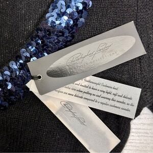 Lightweight 100% Cashmere with sequined neck line. Ribbed hem and cuffs. Long sleeved. V neck.