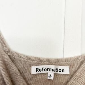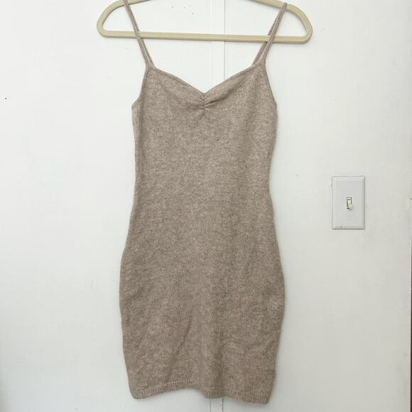 Neutral/tan sleeveless cashmere spaghetti strap cami mini dress with cinched accent at bust.