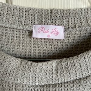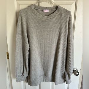 Beige in color, incredibly soft, slit detail on sides, oversized fit with waffle knit texture. I have two and love them so much that I can’t part with the second. Perfect with leggings or jeans.