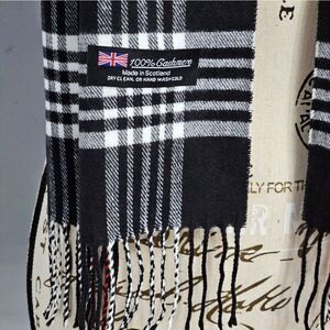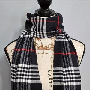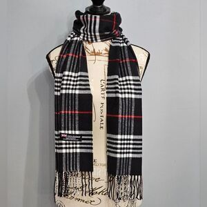 Cashmere scarf in black, red, and white plaid. New-unisex