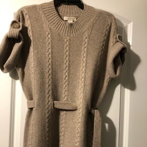 Medium weight cable knit cashmere sweater with cashmere belt so you may cinch at waist. Button on the sleeves. Short sleeve. Wear alone or layer with a long sleeve top underneath. Hits at about mid thigh. Soft beige color.