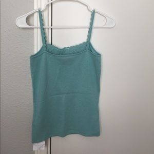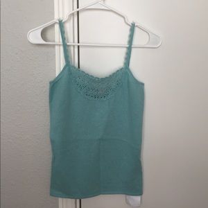 100% cashmere, never worn, pretty robin egg blue color with crochet trim in front and scalloped straps.