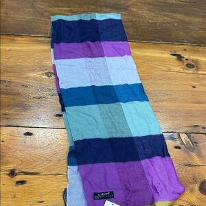 Stylish purple and green scarf by Cashmink. Features fringe detailing.