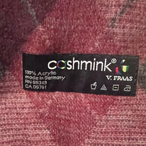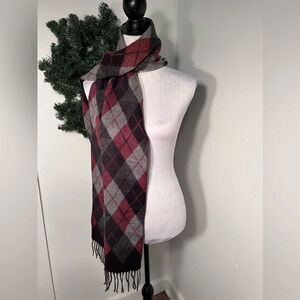 Cashmink by V.FRAAS, Burgundy & Gray undertone argyle pattern scarf w/fringe 64”L, 12”W 100% acrylic made in Germany excellent preowned condition