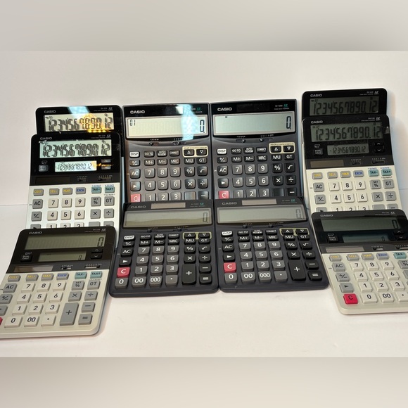 Diverse Casio calculators in black, gray, and white. Ideal for school or office tasks.