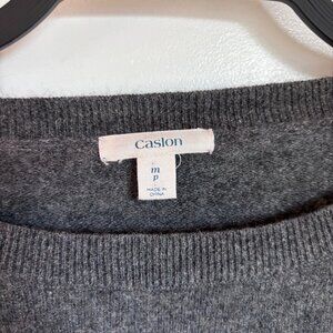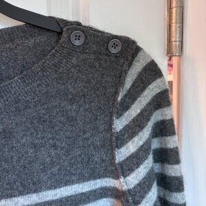 Luxuriously soft 100% cashmere sweater by Caslon, Nordstrom’s in-house brand. Features charcoal and light gray horizontal stripes, button accents at the shoulder and cuffs, ribbed trim, and a classic crew neckline. Size Medium Petite. A timeless piece that elevates everyday wear—perfect layered over collared shirts or paired with jeans for chic casual looks.