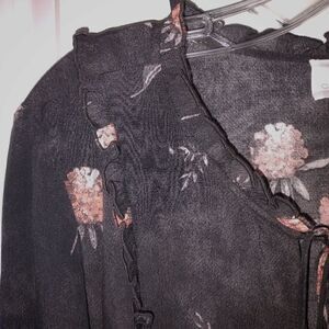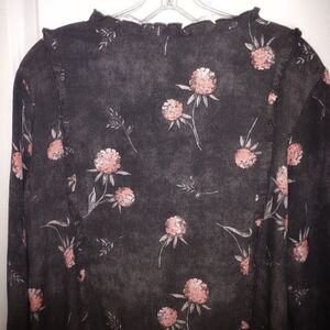 Caslon Black washed look with Pink Floral Prints. Long sleeves with cuffs, ruffle down bodice.