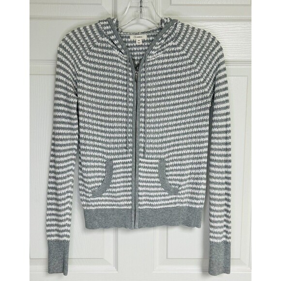 Caslon Full Zip Hoodie Sweatshirt Women's XS White Gray Stripe Sheer Cotton