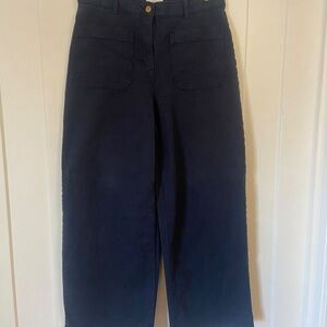 Wide leg stretch twill pants in navy with two patch pockets in front. Zip fly and button closure. Only worn a few times, in great condition.