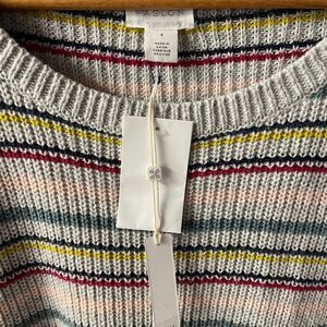 Cute light gray knit sweater with a round neckline and colorful stripes. One shoulder has button detailing. New with tags. Never been worn. This would look cute with jeans and shorts for a casual look during cooler Spring days. This would also look cute tucked into a midi or maxi skirt and oxfords or Mary Janes for a grandma look. Approximate measurements shown in photos. Originally $59. Feel free to ask questions or make an offer!