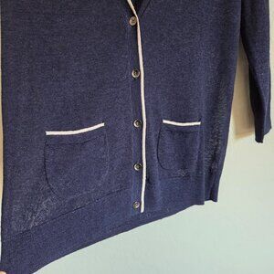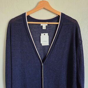 NEW Caslon (Nordstrom) Nautical Preppy Coastal Linen Blend Button Up V-Neck Cardigan Sweater Navy Blue Size Women's Large