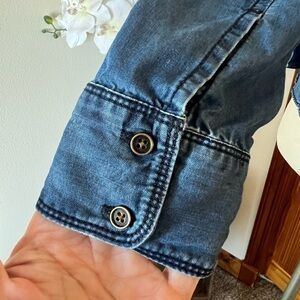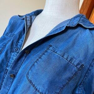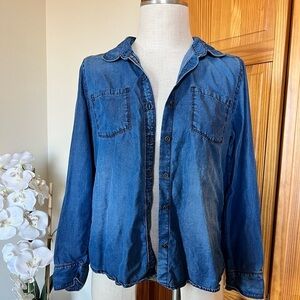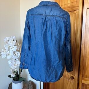 Caslon size medium denim chambray long sleeve button-up shirt. Classic lightweight style with button front closure, perfect for layering or wearing alone. Made from 100% Tencel, giving it a super soft feel and easy drape.