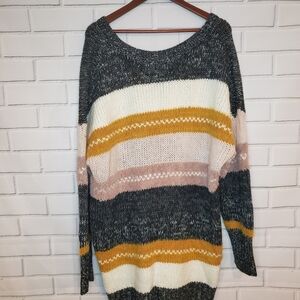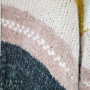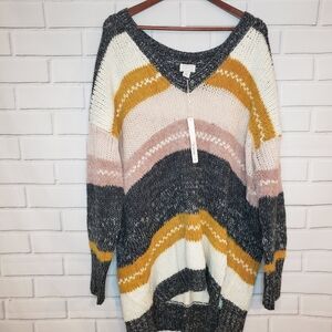 A merry mix of tones, hues and textures stripes this V-neck pullover that's sure to be the hit of sweater season.