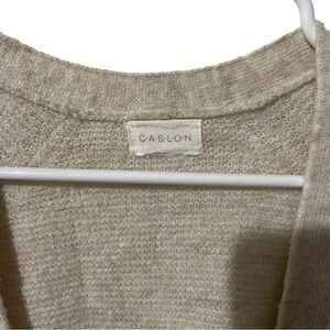 Caslon off white or cream open front cardigan is perfect for fall and winter! Cardigan is a waffle knit and has pockets. Cardigan is an acrylic blend and will keep you warm and cozy! Cardigan size tag is cut out but pit to pit is 18”.