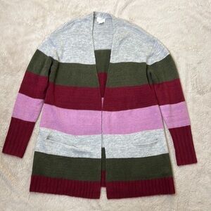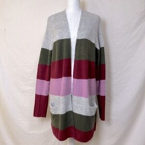 Super soft and comfy open front cardigan sweater. Heather gray, green, burgundy. and pink stripes. Ribbed at the cuffs and hem. Front pockets. Pre-owned but in really good condition.