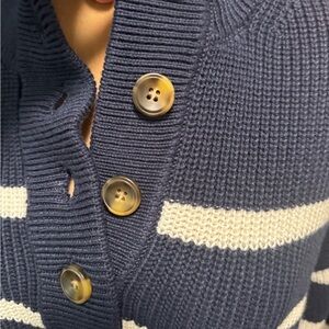 Stay cozy and stylish with this navy and white striped sweater. Perfect for any casual outing.