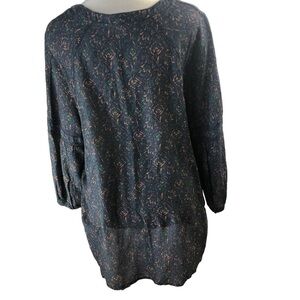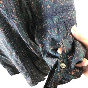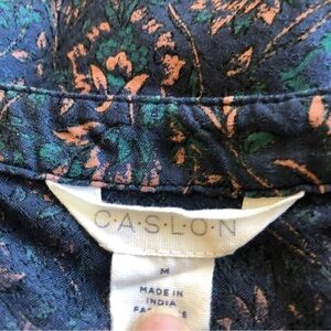 Caslon Popover Blouse Women M Navy Peach Green Botanical Print RoundNeck with V