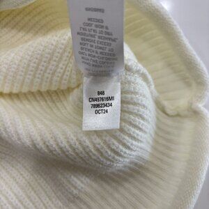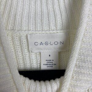 This is a small sweater by Caslon. This sweater is a relaxed fit, long sleeve sweater made with 57% cotton in it's blend to introduce natural softness and comfort, as well as integral durability and longevity to the garment. This sweater is tightly knit to give a classy ribbed texture to the entire piece, with slight differences in the ribbing on the trim and the seams, like the raglan arm seam, or the light mock neck. The trim on the sleeves, bottom, and mock neck are also rolled a bit to add more sophistication and style to it's exterior presentation. It is a bit thin, providing a bit of warmth while also allowing for it to feel lightweight, and it is in a white or ivory color. This is the perfect sweater for all-day wear to innumerable occasions, easily wearable with pull over closure for lounging, shopping, and more! Pre-loved