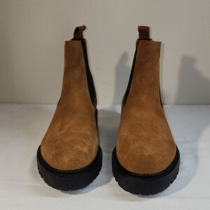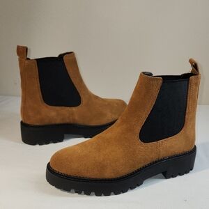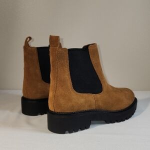 These Caslon ankle boots feature a tan suede upper with contrasting black elastic side panels and a chunky rubber lug sole for enhanced traction. The minimalist Chelsea boot design offers a classic two-tone look, perfect for everyday wear and light outdoor activities.