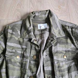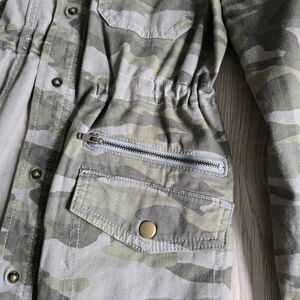 Caslon, Modern, Straight, Denim, Cotton Blend, Long Sleeve, Collared, Snap, Zip Pockets, Thermal, Winter, Spring, Caslon Utility Jacket Womens XS Green Camouflage Denim Snap Zip Pockets Stretch.