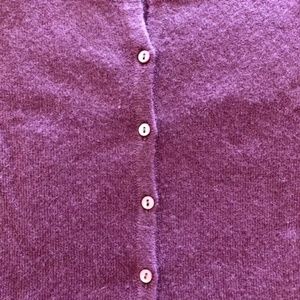 This pretty little cardigan is 100% super-soft cashmere in a lovely shade of purple. Ribbed cuffs and waist; 3/4 sleeves. pretty purple iridescent buttons. Gently used, with no snags, tears, stains, smells, etc.
