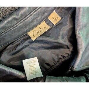 The Caslon Women's Genuine Leather Jacket in Black is a stylish and timeless piece for the colder seasons. This mid-length jacket features long sleeves with a knit sweater design, making it a versatile choice for winter, fall, or spring. The zipper closure and collared neckline add a touch of sophistication, while the vintage look gives it a unique and classic vibe. Made with high-quality leather and insulated with polyester, this jacket is both practical and fashionable, perfect for any woman's wardrobe. THERE DOES SEEM TO BE SOME BLEACH TYPE SPOTS ON BACK AND SLEEVE SHOWN IN PHOTOS. A10 0371