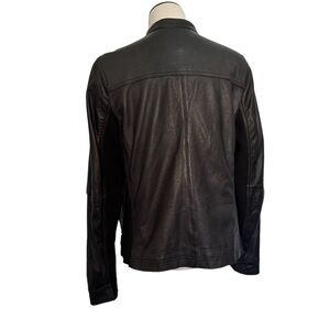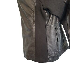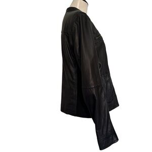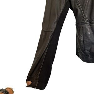 Nordstrom Caslon black leather bomber biker jacket with side. pockets and zipper close pockets at the breast. Please see photos for details as they are part of the description. Great all around leather jacket can be dressed up or down. Classic yet contemporary design. Academia, travel, traditional, moto, biker.