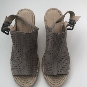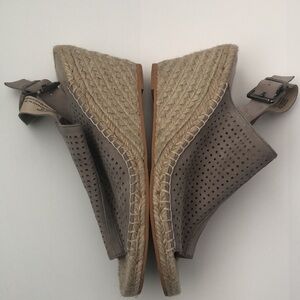 Beautiful comfortable wedges with very soft leather upper. Neutral light beige makes it easy to match any outfit. Straps are adjustable Only worn a few times as shown in pictures and very small darker area of color as shown in last picture, not really noticeable as it is by the strap.