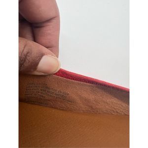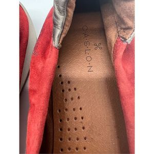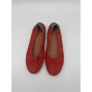 Caslon Bella Flats. In great condition, only defect is sticker residue on back side of one food (see photo). Soft and comfortable with padding in thick sole. Color is more burnt orange with silver back details. Leather upper and round toe shape.