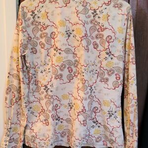Fun paisley western style rodeo shirt with great details including pearl buttons on the closure, cuffs and decorative patch pockets; aforementioned breast patch pockets and front and back darts. Measurements: pit to pit 19", shoulder to cuff 24", shoulder to hem 23", waist 17". Very good used condition. There's some slight bleed from the red design in spots, but it blends in with the overall pattern.