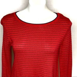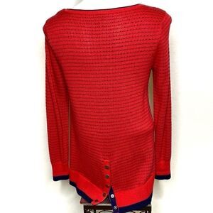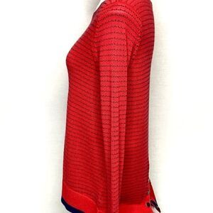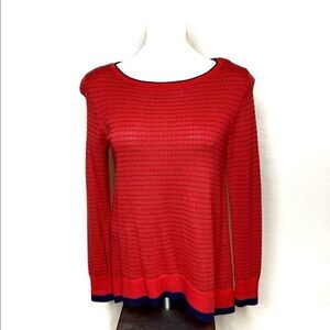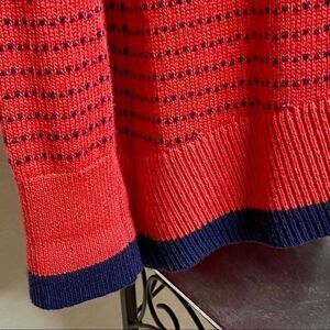Caslon red and blue striped crew neck sweater size S. 5 snap detail on the bottom in the back. Very good condition. 53% cotton 40% rayon 7% nylon. Length 25” front 27” back. Chest 17”.