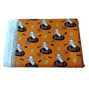 Casper Halloween Boo! Camelot Fabrics Canada 2021 #96390103JAS, all over print of Casper, Bats, Spider Webs & moon - woven cotton blend 108" x 88", NEW Unused cut Fabric. Multi-purpose suitable for a variety of sewing projects such as a table cloth with matching curtains, Halloween costume or apron, throw cover, quilt, decor and more. Clean, no stains or odors ONE SMALL PULL (SEE PIC).