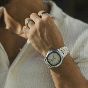 Introducing the Caspian Ice – a sleek stainless steel watch with a clean, frosted white dial. Its crisp design and 40mm case make it a standout piece for those who prefer modern, minimal luxury.