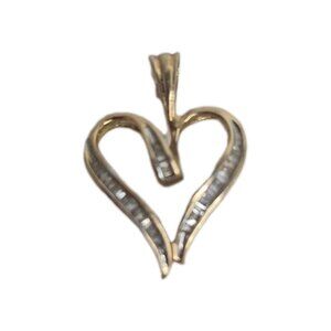 This 1/4ct Diamond Heart Pendant in 10k Yellow Gold is a beautiful piece of fine jewelry perfect for special occasions such as Mother's Day, Christmas, birthdays, anniversaries, and Valentine's Day. The pendant features a heart shape design with a main stone of white/colorless diamond in a baguette shape, set in a channel-set style on 10k yellow gold. It is a timeless and elegant piece that conveys love and beauty, making it a perfect gift for someone special. The pendant also comes with a seller warranty, adding an extra layer of assurance to the purchase.