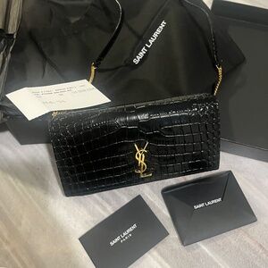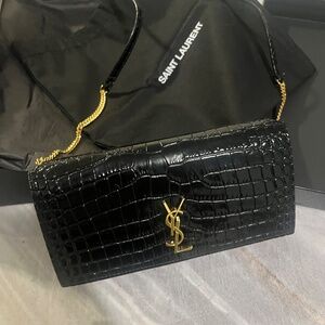 This phone holder with a chain strap is finished with croc-embossed leather and a goldtone logo plaque.