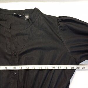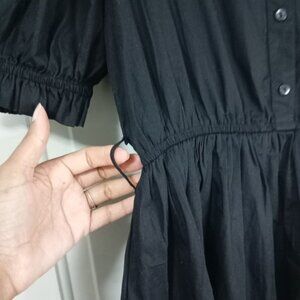 Used in good condition. Measurements and details in the photos. This black mini dress offers a timeless design with puff sleeves, a button-down front, and an elastic waistband for a flattering fit. Crafted with a cotton exterior and lined interior, it balances comfort and elegance for a versatile wardrobe addition. • Puff sleeves with elastic ruffle cuffs • Button-down closure for easy wear • Fully lined for added comfort • Elasticized waist for a tailored fit • Made from breathable cotton material.