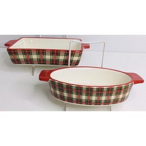 This beautiful casserole dish set from the Grace Bake Shop collection is the perfect addition to your holiday table. Featuring a festive design of a red truck with a Christmas tree and plaid pattern, these rectangular oval dishes are both decorative and functional. The set includes two ceramic dishes, with a capacity of 00, and can be used in electric, gas, or microwave ovens.