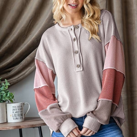 Stylish colorblock sweatshirt with button-up design. Features cream, pink, and tan shades. Perfect for casual wear.