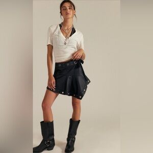 So cool with moto edge, this bold skirt from our We The Free collection features a buttery vegan leather fabrication with wrap silhouette, asymmetrical piecing, and grommet hardware for added dimension.