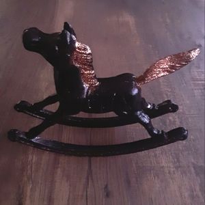 A handsome little cast-iron horse. Heavy, rocks easily. Solid, no breaks or flaws. Made to last for years to come!Designed to weather and distress beautifully, some sparkle & finish will be lossed with handling over time. 5 1/2" height × 7" length