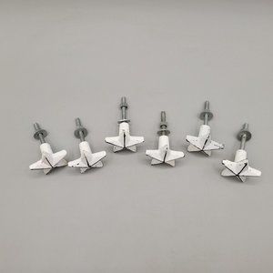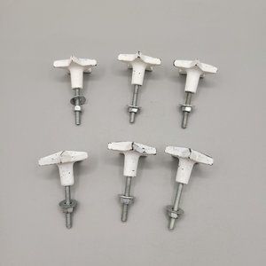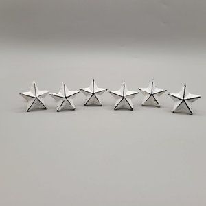 Set of 6 cast iron drawer knobs in the shape of stars with an antiqued white over black finish. Hardware included. Unknown brand.