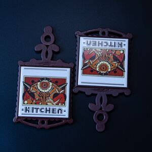 Cast Metal Trivet Fruit Ceramic Tile MCM Granny Cottage 70’s Hippie Brown Red
