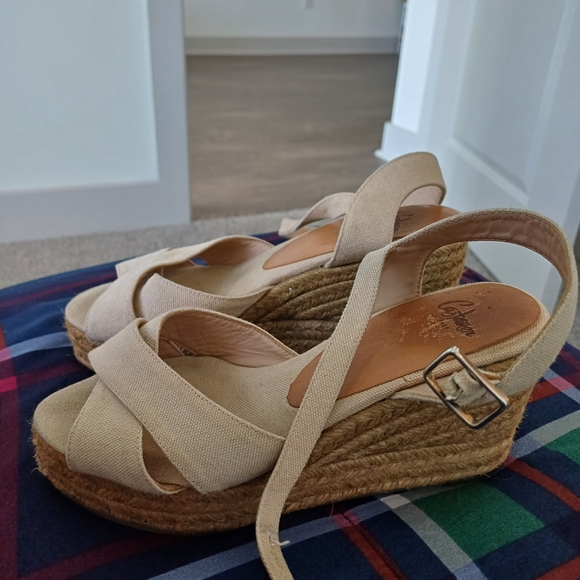 Elevate your summer style with these Castaner cream platform espadrilles, featuring a chic crisscross strap design and a classic jute wedge heel. The ankle strap with buckle closure ensures a secure fit, while the neutral tone adds versatility to your wardrobe.