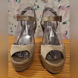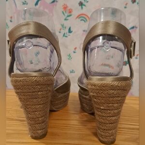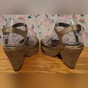 Castaner Metallic Gold Silk & Jute Wedge Boho Neutral Peep Toe Heel Shoe SZ 38