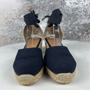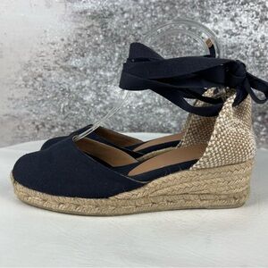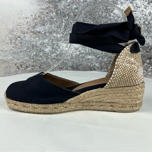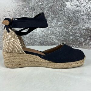 Stylish navy espadrilles with tan woven heel. Comfortable wedge design. Perfect for casual outings.