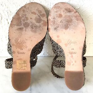 Castaner women's size 9 sandals are in excellent condition. Black and gold woven raffia upper with buckle closure slingback. Wrapped wedge heel. Leather insole and outsole.