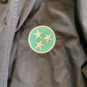 Features & Closure: Zip front with snap closure, convertible high-neck or pointed collar with tie strings, star patch on chest, side flap pockets, interior lining with inner pocket