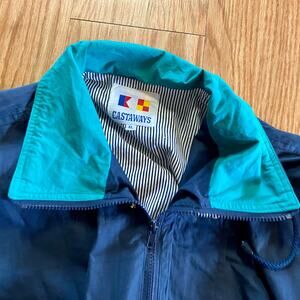 Vintage 1990s Castaways nautical windbreaker with convertible collar, and oversized boxy fit. Classic coastal outerwear piece perfect for outdoor adventures and retro casual style.