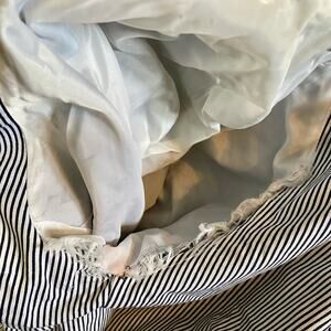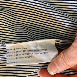 Material & Color: Polyester and cotton blend; solid blue exterior with blue and white striped interior