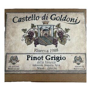 Elegant wall art featuring a vintage-inspired *Castello di Goldoni* Pinot Grigio wine label design, dated Riserva 1988. This decorative piece by Daphne B. / Pela-Concept Inc. (2005) captures the charm of Italian vineyards with a classic crest, grapes, and castle motif printed on a textured surface. Perfect for kitchen, dining, or wine-themed décor.